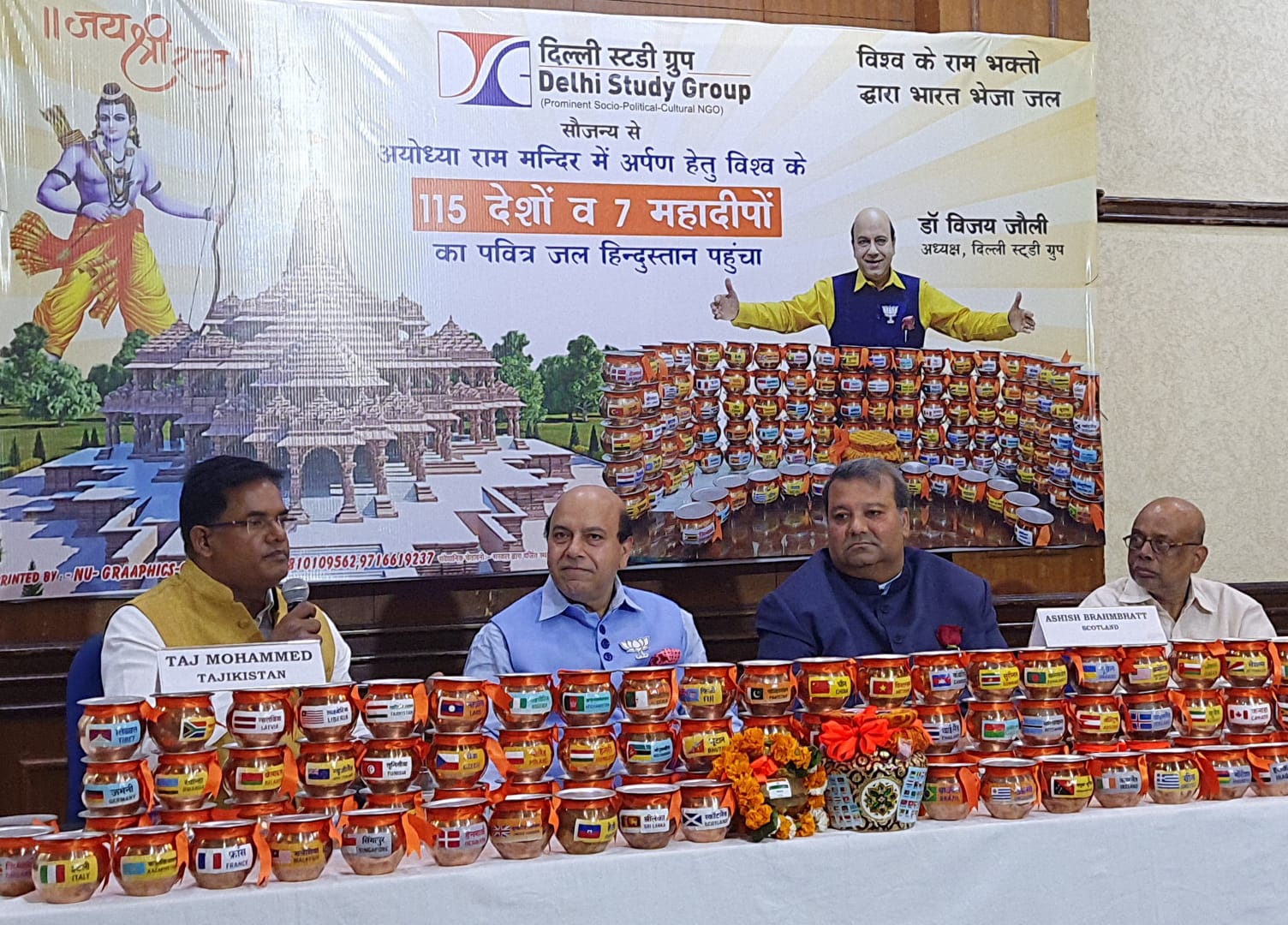 नई दिल्ली, 25 अगस्त 2021/Press Release: डॉ. विजय जौली, अध्यक्ष दिल्ली स्टडी ग्रुप (प्रमुख सामाजिक-राजनीतिक-सांस्कृतिक गैर सरकारी संस्था) व पूर्व दिल्ली भाजपा विधायक के आह्वान पर 115 देशों व 7 महाद्वीपों का पवित्र जल अयोध्या राम मंदिर में अर्पण हेतु भारत पहुँचा है।