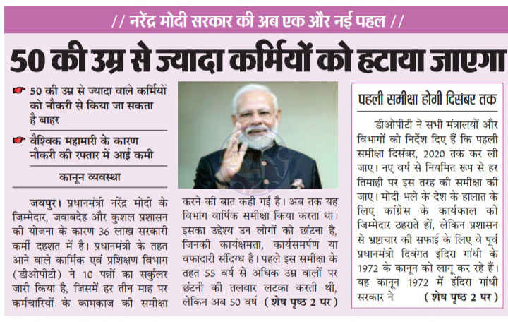 एक झटके में 30 हजार लोग बेरोजगार हो जाएंगे। अब केंद्र सरकार ने एक नई नीति लागू कर फरमान जारी कर दिया की सरकारी कर्मचारिओं को अब 50 के उम्र में ही सेवानिर्वित कर दिया जायेगा। यह देश का दुर्भाग या विडंबना कहा जाये या देश के नौजवानो का सौभाग्य या कर्मचारिओं का दुर्भाग्य कहा जाए, जो एक ओर देश के सरकारी कर्मचारिओं को बेरोज़गार बना रही और दुसरी और भारत के युवाओ के साथ राज़गार देने का छलावा कर रही है। केंद्र सरकार वर्तमान में सरकारी कम्पनियों को निजीकरण कर के देश को बेरोजगारी के अलावा और क्या देने जा रहा है? पीटीआई के हवाले से ही इस योजना से 30,190 कर्मचारी बेरोज़गार हो सकते हैं।